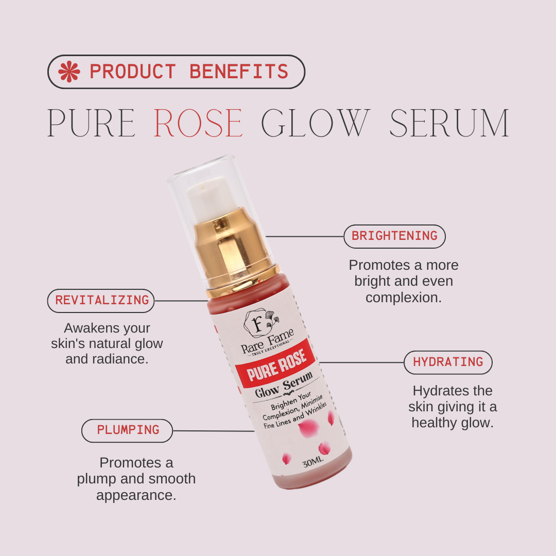 Hydration and Nourishment: Pure Rose Glow Serum deeply hydrates the skin. It nourishes the skin from within, helping to maintain a healthy moisture barrier and preventing dryness.