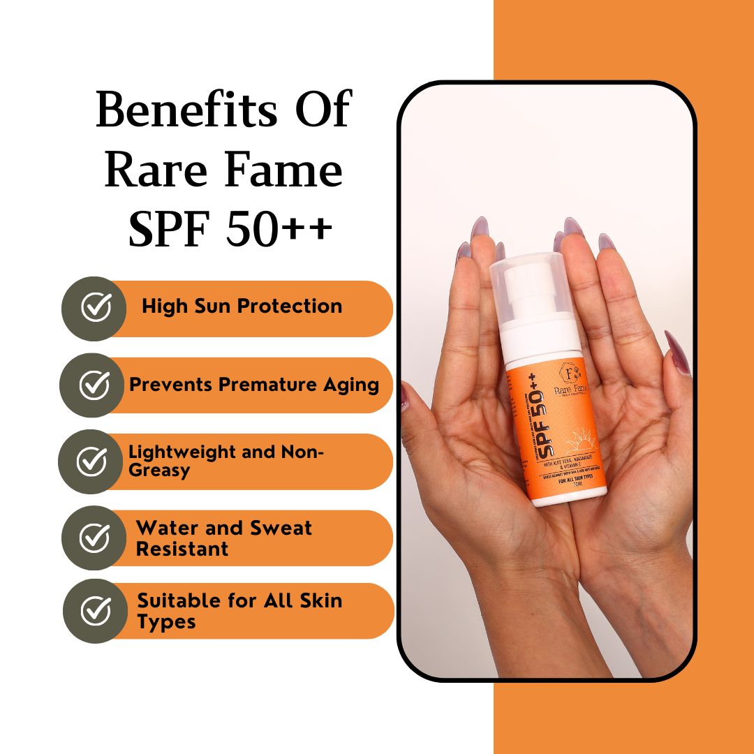 Advanced Formulation: Rare Fame SPF 50++ incorporates an advanced formulation that provides high-level protection against both UVA and UVB rays.