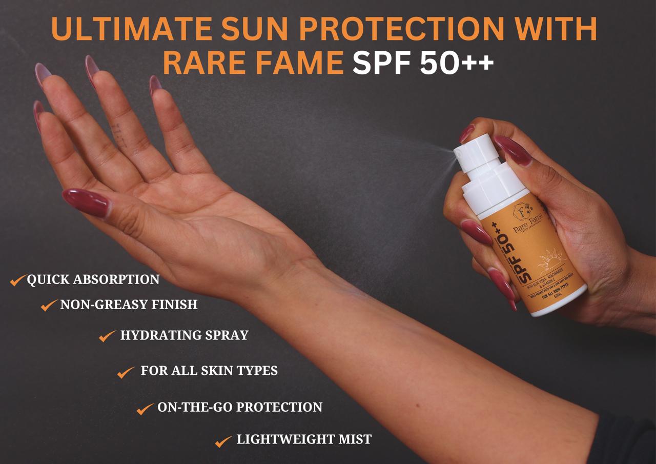 Once applied, the Rare Fame SPF 50++ Spray provides a high level of sun protection. It helps shield your skin from harmful UVA and UVB rays, reducing the risk of sunburn and long-term skin damage.