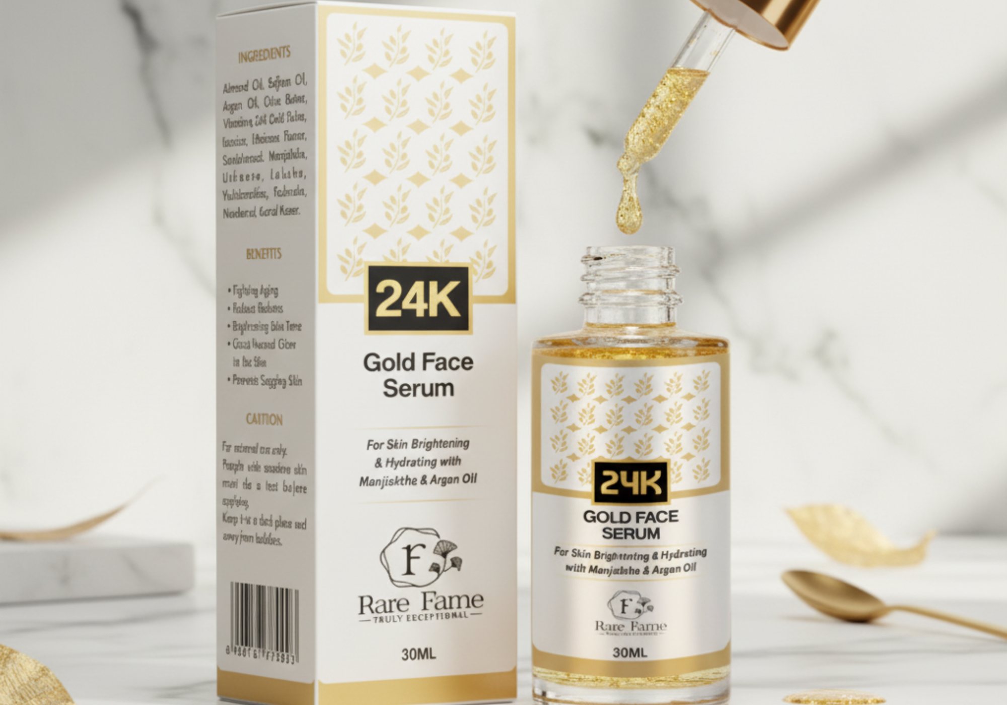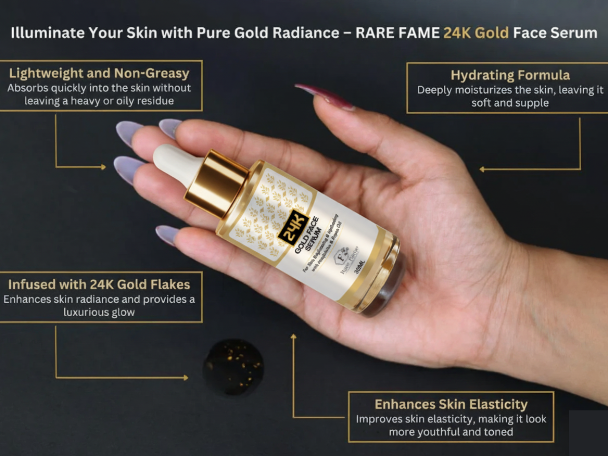 Brightening Effect: Rare Fame 24K Gold Face Serum can give the skin a radiant glow. The particles reflect light, creating a luminous effect and helping to brighten dull or uneven skin tone.